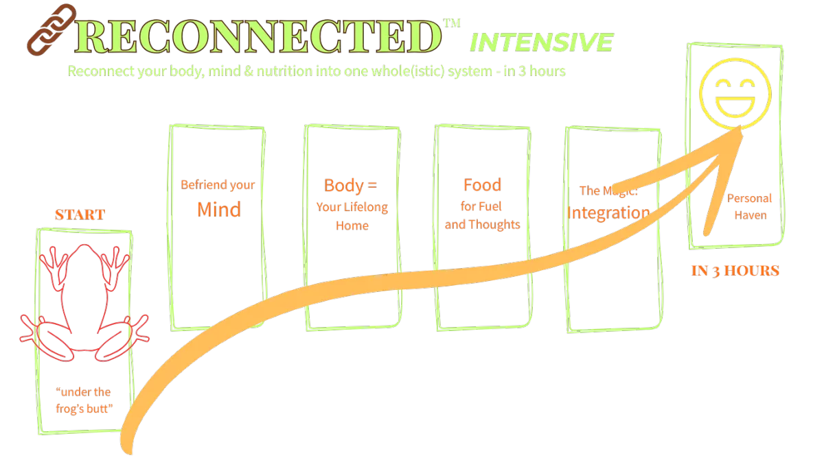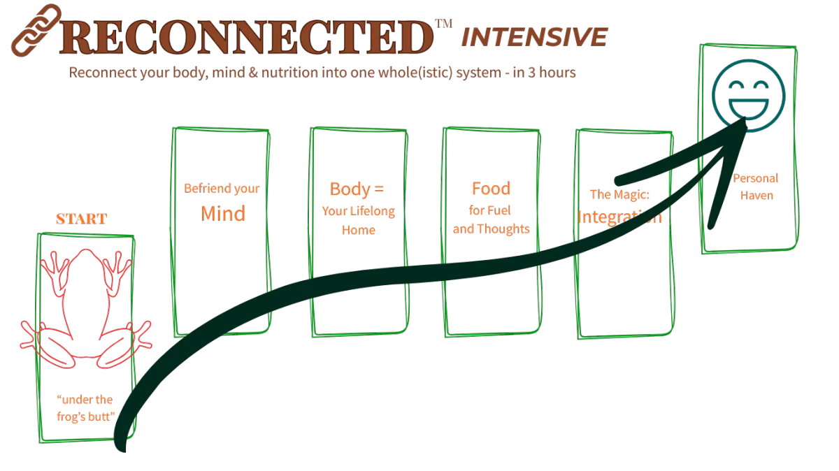 👉 In this 3-hour Reconnected™ Intensive, I’ll personally guide you out from under the frog's butt (left image) to your own personal haven (right).
